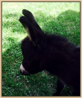 Seleese has given me several spotted boys in a row so this was quite the surprise that she had a beautiful black boy this time around. She had a difficult delivery last time so we played it safe and had her foal out at the clinic. Also she was absolutely huge so worried this baby might be too big. She also had hydros amnion which is too much fluid and they worry about going into shock when losing too much at once. Well thank the Lord she popped him out in about 20 minutes with no issues at all. Jo Jo is a total lap donkey loverly. He will stand there all day if you are giving him hugs and kisses. He will be a wonderful gelding for children or adults alike. Anyone would be blessed to own this beautiful sweet boy.